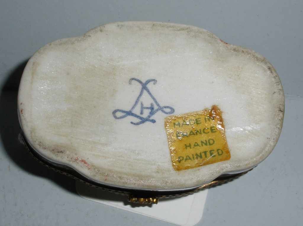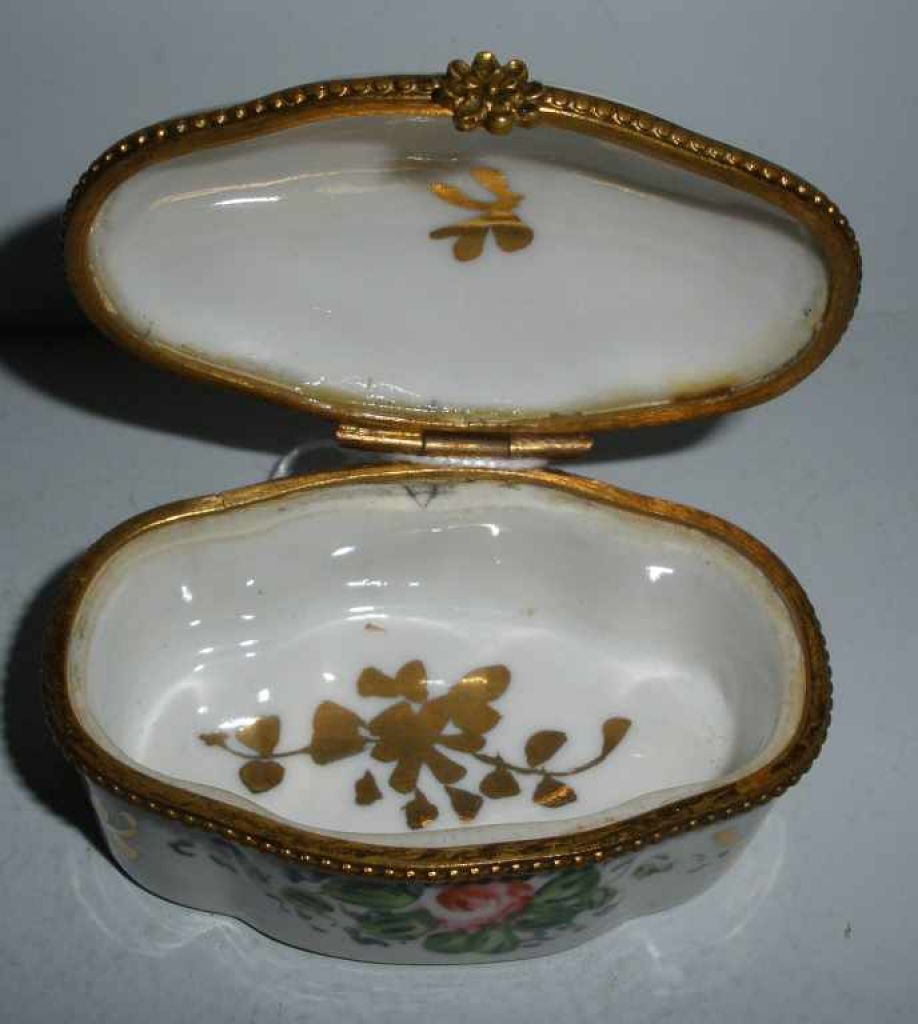 Oval floral covered hinged box writing on top France. 1 2/3" width x 2 1/2" length x 1 1/4" height Oval floral covered hinged box writing on top France. 1 2/3" width x 2 1/2" length x 1 1/4" height