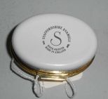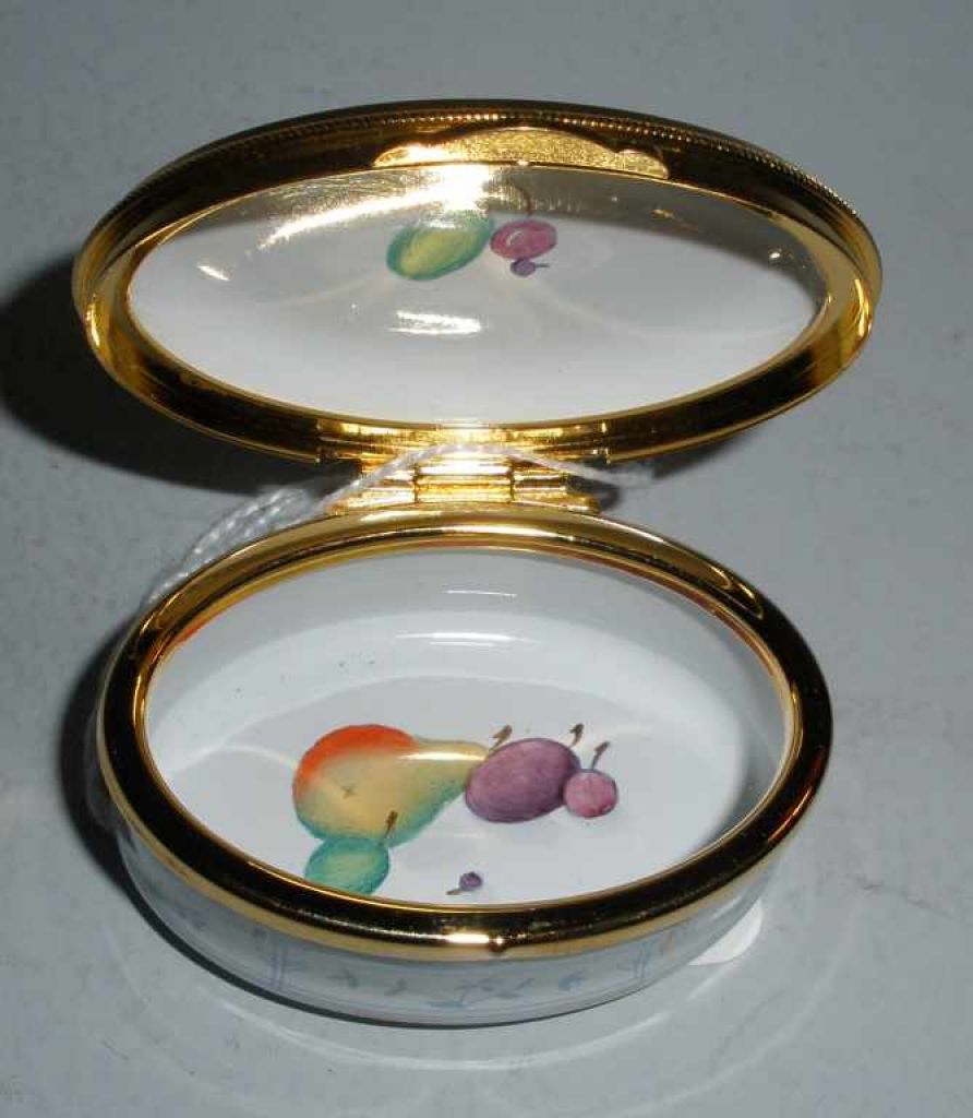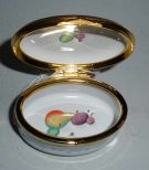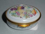 Staffordshire oval enameled covered box with fruit. 1 1/2" width x 2" length x 1" height Staffordshire oval enameled covered box with fruit. 1 1/2" width x 2" length x 1" height
