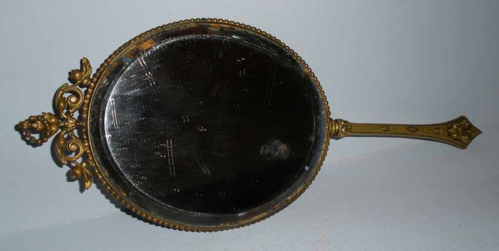 Ornate brass framed hand mirror with figural scene back & raised gold decorations - 9" tall by 3" wide Ornate brass framed hand mirror with figural scene back & raised gold decorations - 9" tall by 3" wide