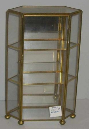 Small display case with brass frame glass shelves mirrored back ball feet Small display case with brass frame glass shelves mirrored back ball feet