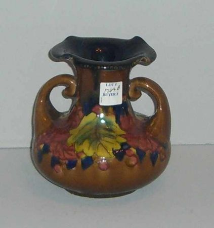 rare multi colored leaf decorated flared top double handle vase Made in Japan rare multi colored leaf decorated flared top double handle vase Made in Japan