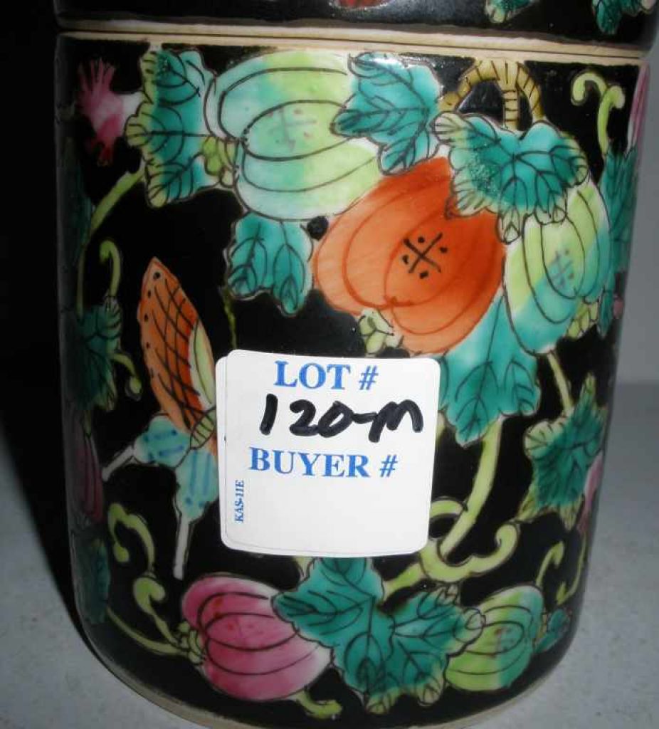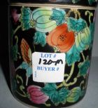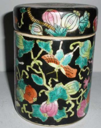 Small Round Oriental Jar with Lid Decorated with Fruit & Butterflies Small Round Oriental Jar with Lid Decorated with Fruit & Butterflies