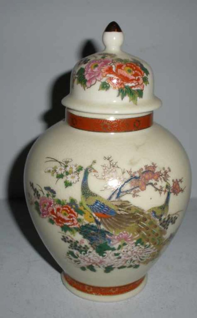 Small Satsuma Jar with Lid Decorated with Peacocks Small Satsuma Jar with Lid Decorated with Peacocks