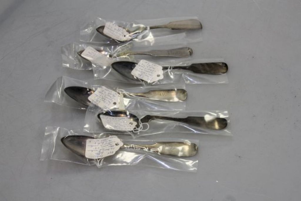Five early N.Y. coin silver spoons, one Ohio. Five early N.Y. coin silver spoons, one Ohio.