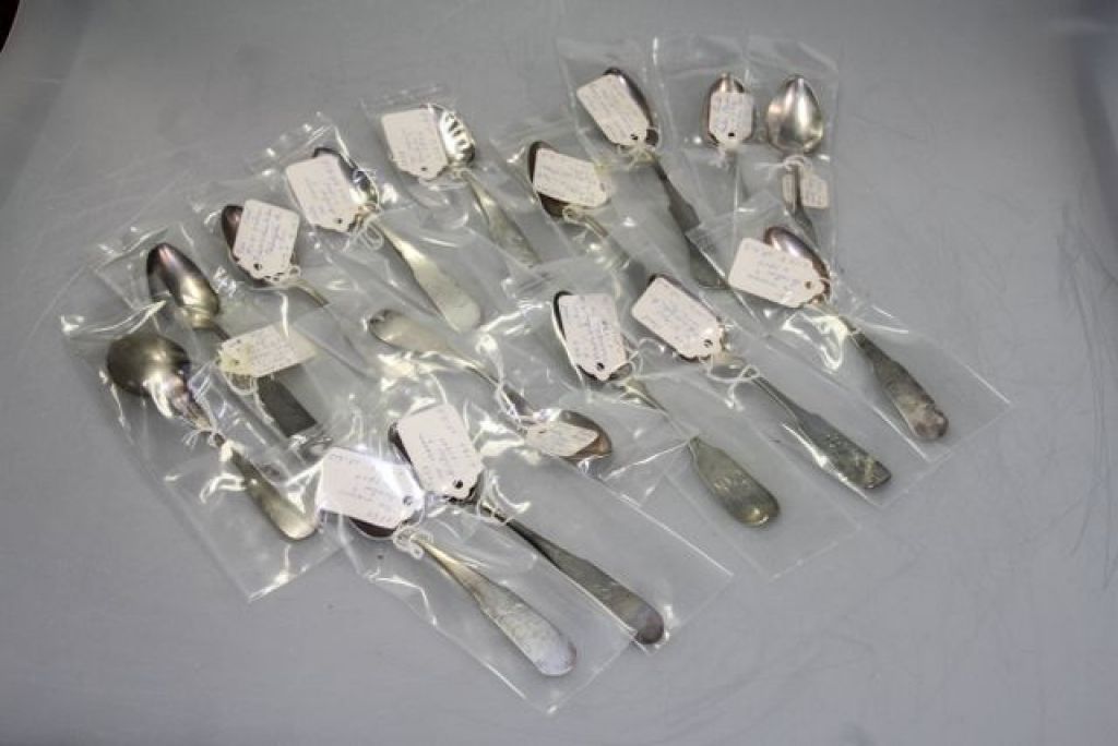 Four early 1800's Pennsylvania coin silver spoons, two Massachusetts spoons, one sterling spoon, three Ohio spoons & five no origin coin spoons Four early 1800's Pennsylvania coin silver spoons, two Massachusetts spoons, one sterling spoon, three Ohio spoons & five no origin coin spoons