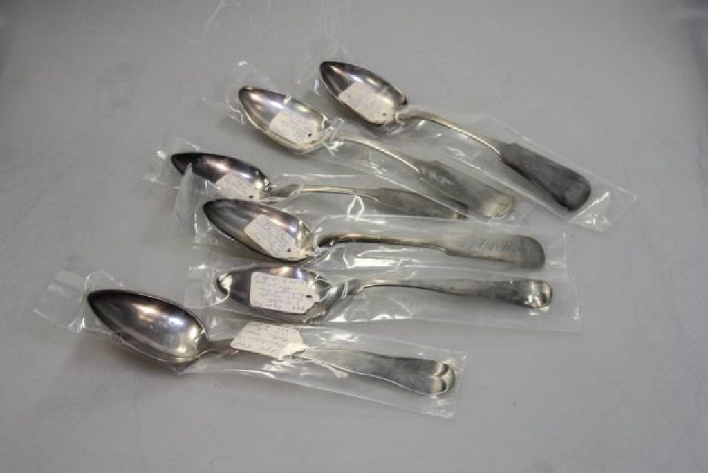 Two large 8" Massachusetts coin silver serving or table spoons & four large 8" New York coin silver spoons Two large 8" Massachusetts coin silver serving or table spoons & four large 8" New York coin silver spoons