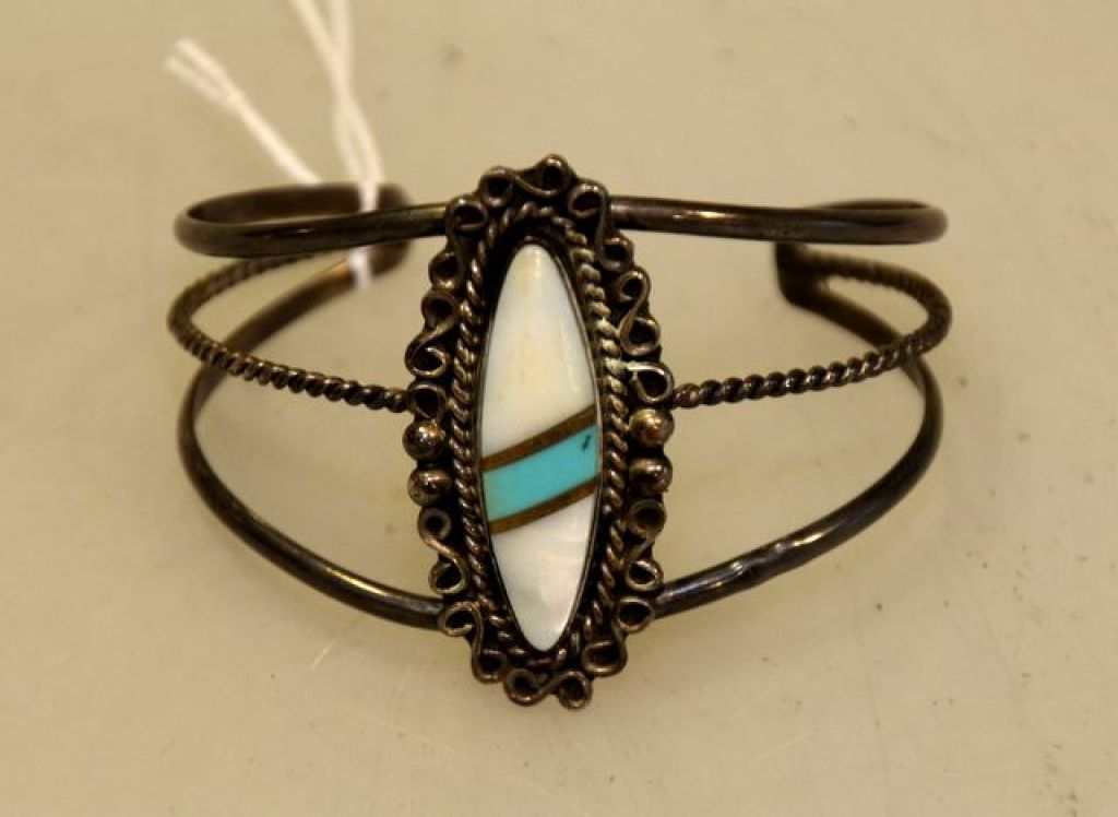 Silver cuff with inlaid mother of pearl, turquoise marked "NJ" Silver cuff with inlaid mother of pearl, turquoise marked "NJ"