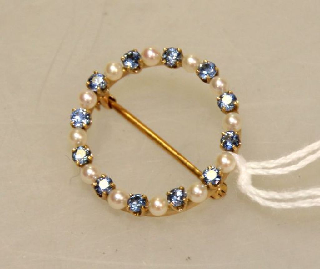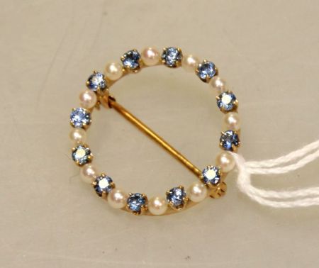 5551 14K Gold Sapphire and Seed Pearl Circle Brooch
