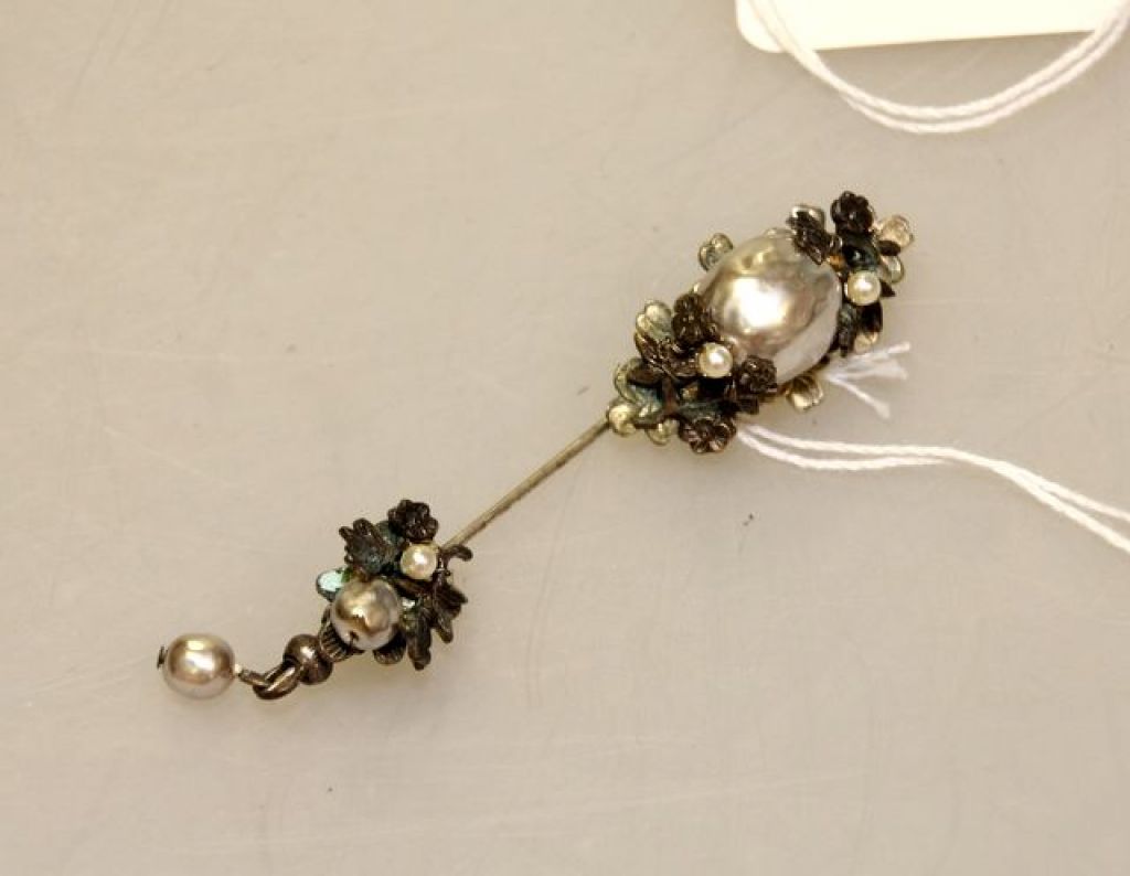Miriam Haskell stick pin with baroque pearls, seed pearls & silvertone Miriam Haskell stick pin with baroque pearls, seed pearls & silvertone