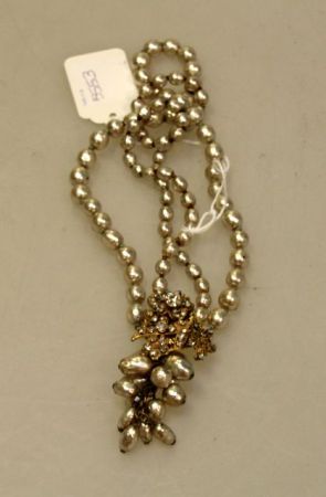 Miriam Haskell baroque pearl double strand necklace with cluster gilded metal clasp with roses, montees and grape cluster drop. Designed by Frank Hess 1950's Miriam Haskell baroque pearl double strand necklace with cluster gilded metal clasp with roses, montees and grape cluster drop. Designed by Frank Hess 1950's