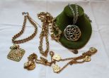 This is a signed jewelry lot of pendants and necklaces. There are two Coro, Napier, Trifari, Star, and Direction One. This is a signed jewelry lot of pendants and necklaces. There are two Coro, Napier, Trifari, Star, and Direction One.