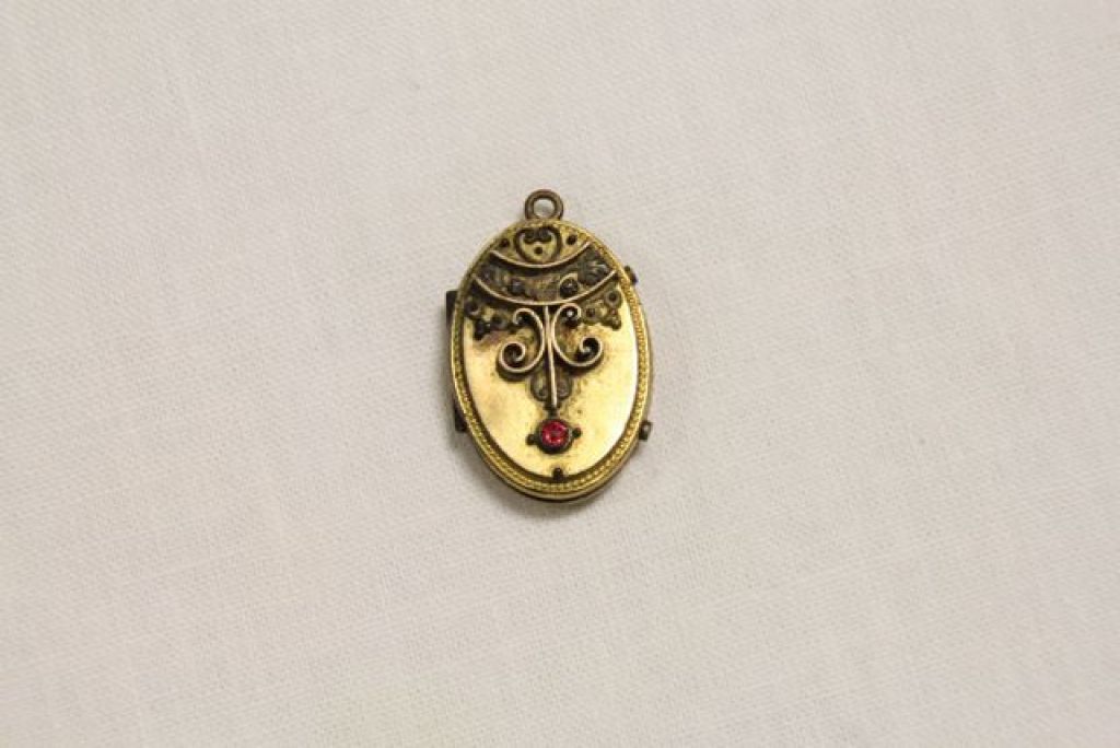Victorian Locket with applied decoration and a red faceted stone. Inside has frames for photos one with its glass still present. Victorian Locket with applied decoration and a red faceted stone. Inside has frames for photos one with its glass still present.