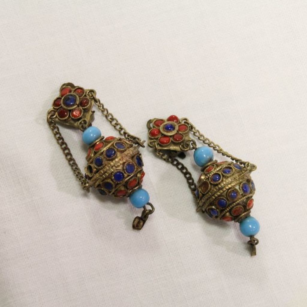 Persian made brass with multi stones of lapis, coral and turquoise. Long drops from chains. Note there are some missing stones. Persian made brass with multi stones of lapis, coral and turquoise. Long drops from chains. Note there are some missing stones.