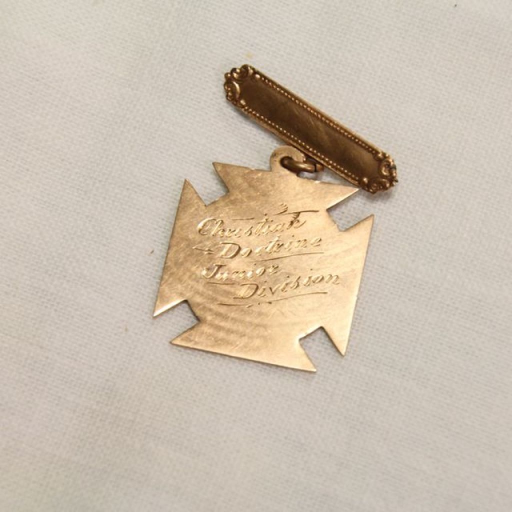 Award pin tests as 10K gold with a non gold pin back. Monogrammed on the front, "CSA" has inscription on back, "Christian Doctrine Junior Division". Award pin tests as 10K gold with a non gold pin back. Monogrammed on the front, "CSA" has inscription on back, "Christian Doctrine Junior Division".