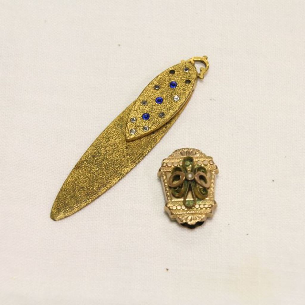 A gold filled Victorian slide with applied filigree and a central seed pearl with a unidentifiable item brass with inset rhinestones. A gold filled Victorian slide with applied filigree and a central seed pearl with a unidentifiable item brass with inset rhinestones.