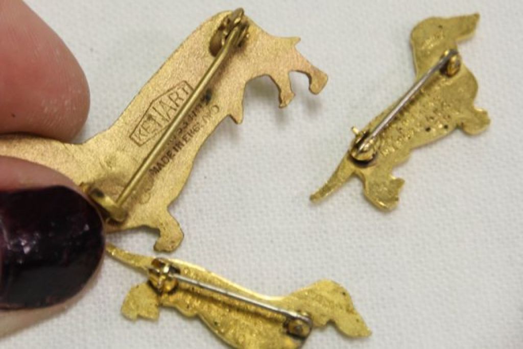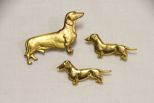 Trio of patented Kenart Dachshund Pins with one large and two smaller dogs. Trio of patented Kenart Dachshund Pins with one large and two smaller dogs.