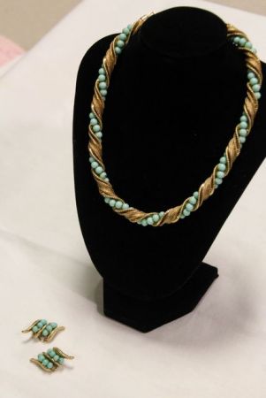 Napier Choker and clip on earrings with wired faux turquoise beads in a wrap design. Intertwined with gold tone multi wire metal. Napier Choker and clip on earrings with wired faux turquoise beads in a wrap design. Intertwined with gold tone multi wire metal.
