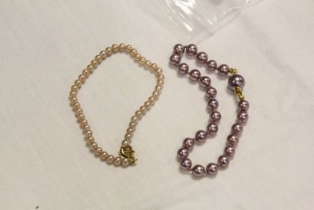One purple faux pearl bracelet and one white faux pearl bracelet. One purple faux pearl bracelet and one white faux pearl bracelet.