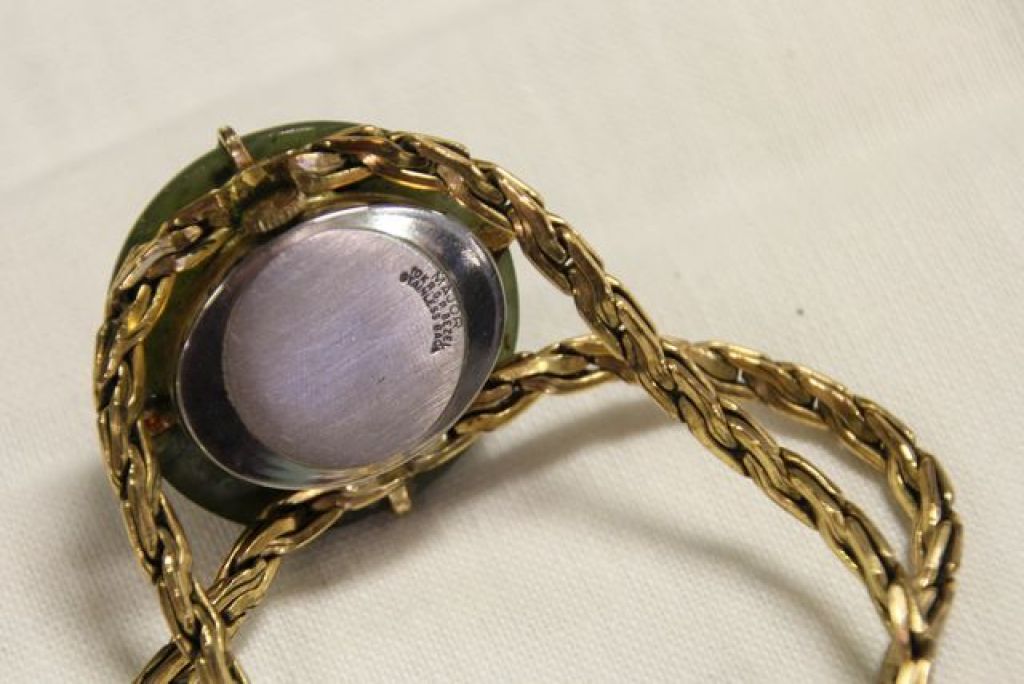 One ladies vintage manual wind watch with jade bezel. Neiman Marcus retailer with 10k Rolled gold plate bezel and 12k Gold Filled chain wristband. One ladies vintage manual wind watch with jade bezel. Neiman Marcus retailer with 10k Rolled gold plate bezel and 12k Gold Filled chain wristband.