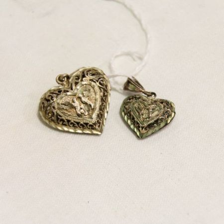 Pair of filigree silver hearts with cut metal design. No marks. Pair of filigree silver hearts with cut metal design. No marks.
