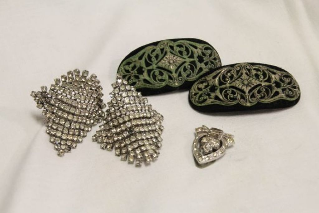 Two pairs of shoe clips one in rhinestones the other in a sliver tone metal. One rhinestone dress clip Two pairs of shoe clips one in rhinestones the other in a sliver tone metal. One rhinestone dress clip