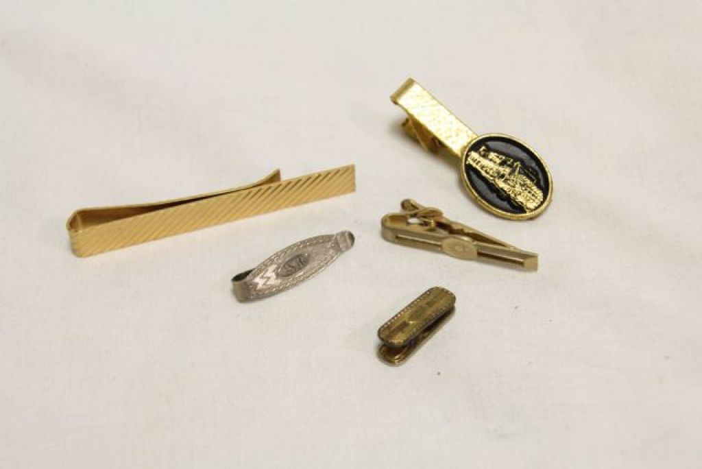 Five vintage tie bars, Two small engraved bars, two gold tone bars, and one steamboat bar. Five vintage tie bars, Two small engraved bars, two gold tone bars, and one steamboat bar.