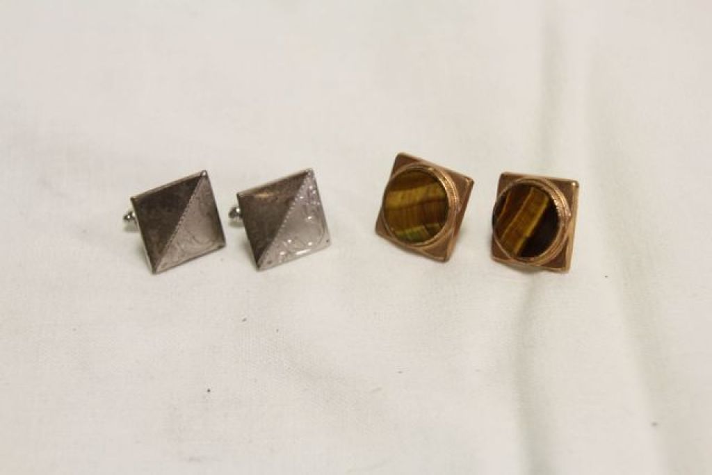 One pair of engraved sterling silver front cufflinks and one tiger's eye gold filled cuff links. One pair of engraved sterling silver front cufflinks and one tiger's eye gold filled cuff links.