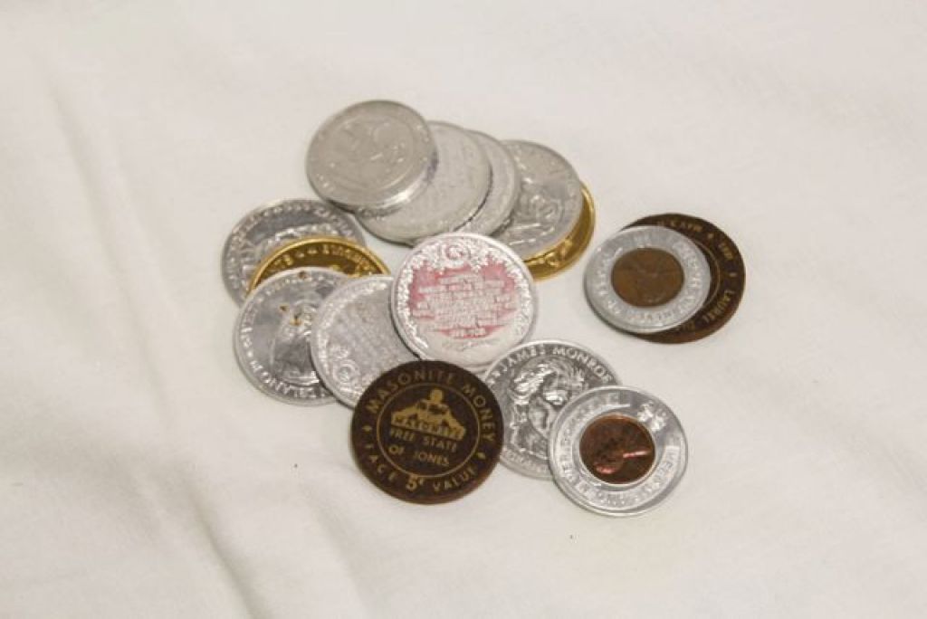 Mixed lot of commemorative coins and two wooden nickels. Mixed lot of commemorative coins and two wooden nickels.