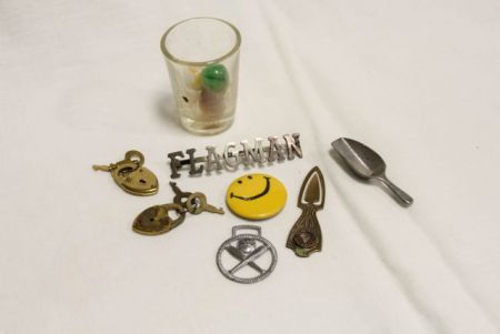 Mixed "junk drawer" bag lot. Includes but is not limited to marbles, tax token, locks, shot glass, etc. Mixed "junk drawer" bag lot. Includes but is not limited to marbles, tax token, locks, shot glass, etc.