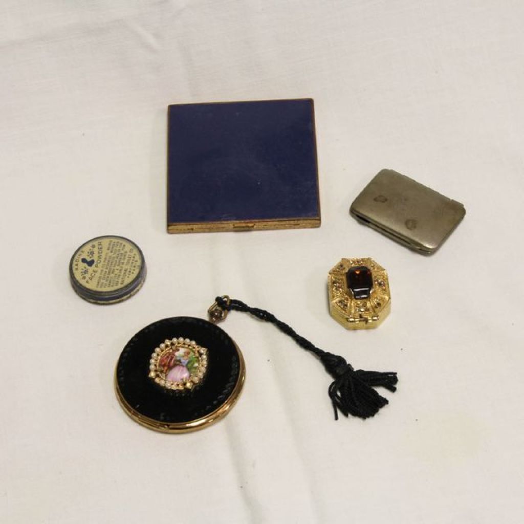 Group of five items. One small tin of Hadine Face Powder with contents, One blue enamel Shields compact, round black enamel with plaque surrounded by pearls and rhinestones. A faceted amber stone with rhinestone pill box and one base metal compact. Group of five items. One small tin of Hadine Face Powder with contents, One blue enamel Shields compact, round black enamel with plaque surrounded by pearls and rhinestones. A faceted amber stone with rhinestone pill box and one base metal compact.