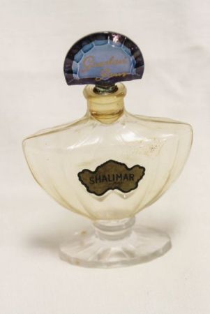 Vintage Baccarat Shalimar Guerlain bottle with original paper label and glass stopper. Vintage Baccarat Shalimar Guerlain bottle with original paper label and glass stopper.