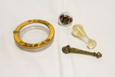 Ashtray, Brass bell, Heidelberg German knob or Stopper Cap. Hand blown glass object. Ashtray, Brass bell, Heidelberg German knob or Stopper Cap. Hand blown glass object.