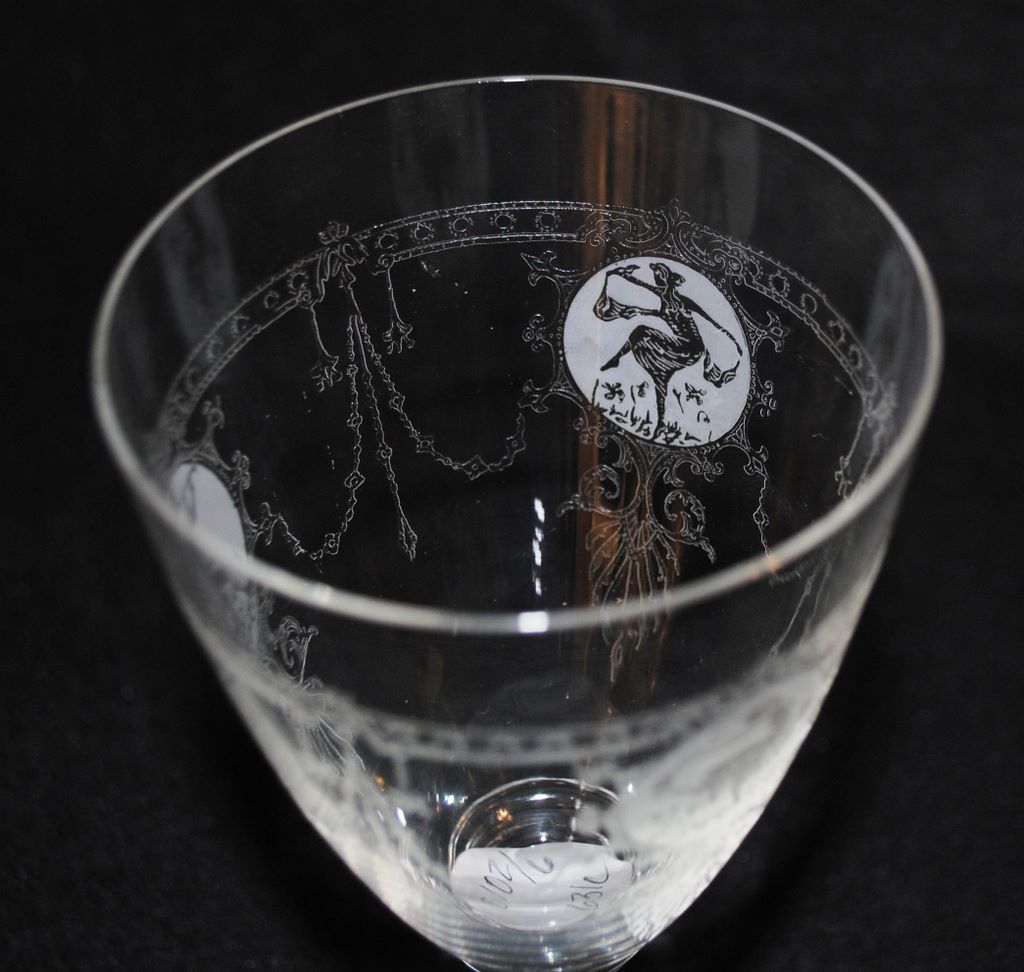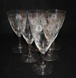 Set of 6 Heisey #3350 "Wabash" 10oz goblets w/#439 "Pied Piper" etching, signed stem Set of 6 Heisey #3350 "Wabash" 10oz goblets w/#439 "Pied Piper" etching, signed stem