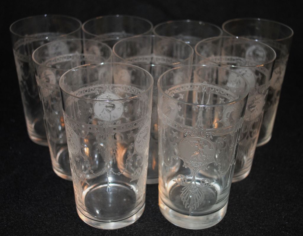 Set of 9 Heisey 4 1/4"h non-optic tumblers w/#439 "Pied Piper" etching, one tumbler with flake to inside rim. Set of 9 Heisey 4 1/4"h non-optic tumblers w/#439 "Pied Piper" etching, one tumbler with flake to inside rim.
