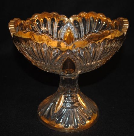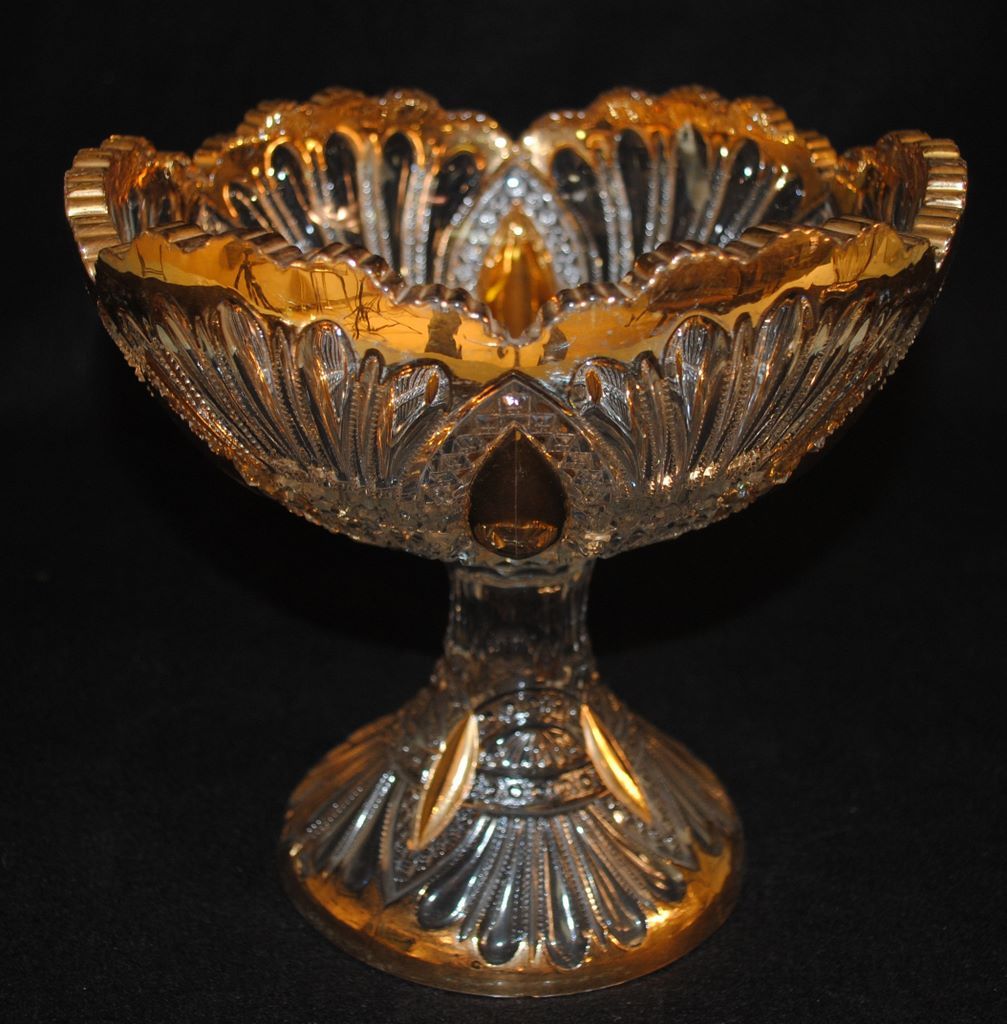 An early Heisey crystal #335 "Prince of Wales" 8"h footed compote w/gilt, signed. Small chip to underside base foot. An early Heisey crystal #335 "Prince of Wales" 8"h footed compote w/gilt, signed. Small chip to underside base foot.