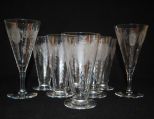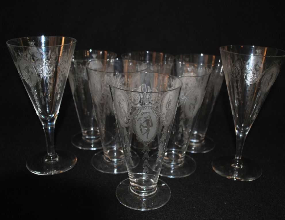 Eight stems in Tiffins c1920 Classic "Dancing Lady" pattern; a pair of 7 1/4" water goblets and six 6"h iced tea tumblers Eight stems in Tiffins c1920 Classic "Dancing Lady" pattern; a pair of 7 1/4" water goblets and six 6"h iced tea tumblers