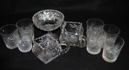 American Brilliant cut glass compote 5"h x 5 1/2"w, together w/ seven 3 3/4"h "Pineapple & Fan" water tumblers, and a floral intaglio cut creamer and sugar, signed "B", hairline to sugar at handle joint. American Brilliant cut glass compote 5"h x 5 1/2"w, together w/ seven 3 3/4"h "Pineapple & Fan" water tumblers, and a floral intaglio cut creamer and sugar, signed "B", hairline to sugar at handle joint.