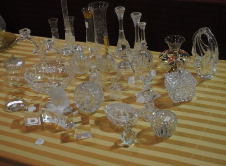 A grouping of 30+ elegant crystal ladies dresser items, including 5 crystal bells, 5 candlesticks, 6 vases, 4 trinket boxes, a cut crystal pin dish, a perfume bottle, a Tiffin hand blown basket, a West German cut glass candy bowl and ash receiver, a set of 4 crystal baby blocks, a frog prince and more A grouping of 30+ elegant crystal ladies dresser items, including 5 crystal bells, 5 candlesticks, 6 vases, 4 trinket boxes, a cut crystal pin dish, a perfume bottle, a Tiffin hand blown basket, a West German cut glass candy bowl and ash receiver, a set of 4 crystal baby blocks, a frog prince and more