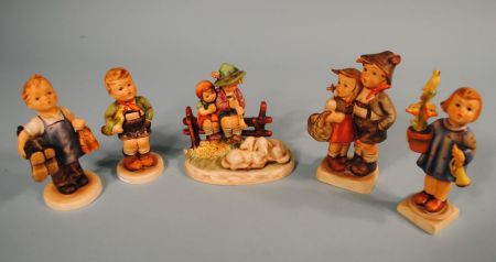 A grouping of 5 Hummell goebel figurines: #94 "Surprise" with impressed and printed TMK2 Full Bee, 5 1/2"h; #143/10 "Boots" with TMK1 Crown and Fall Bee inkstamp, 5 1/4"h; #97 "Trumpet Boy" with TMK2 Full Bee, 5"h w/small flake to edge of trumpet; #17/0 "Congratulations" with TMK3ss, 6"h; and #99 "Eventide" with TMK6, 4 3/4"h A grouping of 5 Hummell goebel figurines: #94 "Surprise" with impressed and printed TMK2 Full Bee, 5 1/2"h; #143/10 "Boots" with TMK1 Crown and Fall Bee inkstamp, 5 1/4"h; #97 "Trumpet Boy" with TMK2 Full Bee, 5"h w/small flake to edge of trumpet; #17/0 "Congratulations" with TMK3ss, 6"h; and #99 "Eventide" with TMK6, 4 3/4"h