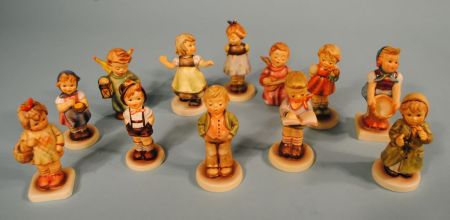 A grouping of 12 Hummel figures: #73 "Little Helper" TMK6, 4 1/4"h; #2183 "Keeping Time" TMK8, 3 3/4"h; #912/B "Spring Waltz" TMK8, 4"h; #2103/A "Puppet Princess" TMK8, 3 3/4"h; #629 "From Me to You" TMK7, 3 1/2"h; #493 "Two Hands, One Treat" TMK7, 4 1/4"h; #479 "I Brought You a Gift" TMK6, 4"h; #630 "For Keeps" TMK7, 3 3/4"h; #848 "Steadfast Soprano" TMK8, 3 3/4"h; #2087/B "Honor Student" 3 3/4"h; #214/D "Angel Serenade" (chip at wing tip); and #2230/K "Angel with Lantern" A grouping of 12 Hummel figures: #73 "Little Helper" TMK6, 4 1/4"h; #2183 "Keeping Time" TMK8, 3 3/4"h; #912/B "Spring Waltz" TMK8, 4"h; #2103/A "Puppet Princess" TMK8, 3 3/4"h; #629 "From Me to You" TMK7, 3 1/2"h; #493 "Two Hands, One Treat" TMK7, 4 1/4"h; #479 "I Brought You a Gift" TMK6, 4"h; #630 "For Keeps" TMK7, 3 3/4"h; #848 "Steadfast Soprano" TMK8, 3 3/4"h; #2087/B "Honor Student" 3 3/4"h; #214/D "Angel Serenade" (chip at wing tip); and #2230/K "Angel with Lantern"