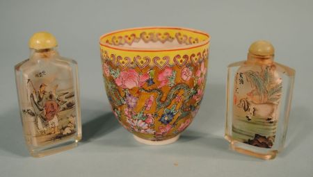 Pair of Chinese snuff bottles w/soapstone lids, both with intricate internal handpainted decoration, ivory snuff spoon inside one bottle is broken, loose piece inside. Together with a Chinese eggshell porcelain gilded famille rose 3 1/4" cup in original fitted case. Pair of Chinese snuff bottles w/soapstone lids, both with intricate internal handpainted decoration, ivory snuff spoon inside one bottle is broken, loose piece inside. Together with a Chinese eggshell porcelain gilded famille rose 3 1/4" cup in original fitted case.