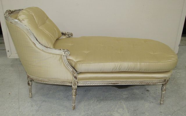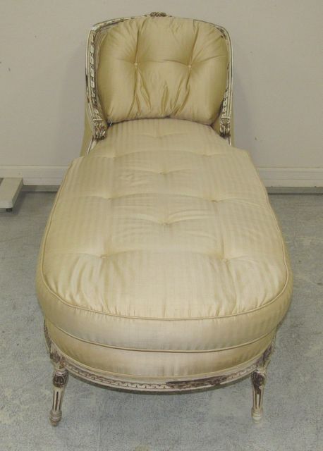 French Provincial carved wood with painted distressed white, sturdy condition, fabric is clean with a little thread wear, 35"h., 65"w. French Provincial carved wood with painted distressed white, sturdy condition, fabric is clean with a little thread wear, 35"h., 65"w.