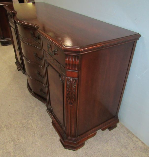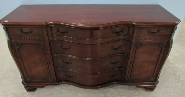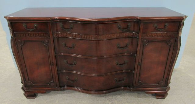 Mahogany sideboard bow front with four center drawers, two side doors, border trim design, has some finish wear, 36"h., 65"w., 23"d. Mahogany sideboard bow front with four center drawers, two side doors, border trim design, has some finish wear, 36"h., 65"w., 23"d.