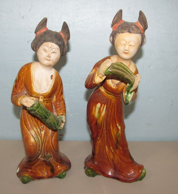 Pottery Tang style glazed pottery of women, has wear and some small chips, 11"h. Pottery Tang style glazed pottery of women, has wear and some small chips, 11"h.