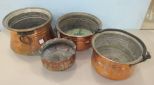 Three made in Turkey copper handled pots largest is 8"h., 11"dia., round footed copper bowl 5"h., 8"dia. Three made in Turkey copper handled pots largest is 8"h., 11"dia., round footed copper bowl 5"h., 8"dia.