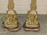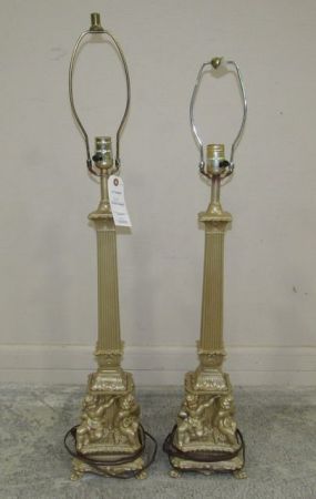 Reproduction metal table lamps, gold color, each with four figural children with paw feet, one needs new shade rod, 34"h. Reproduction metal table lamps, gold color, each with four figural children with paw feet, one needs new shade rod, 34"h.