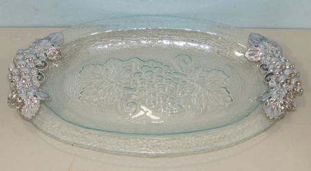 New Arthur Court glass serving tray with metal fruit handles, wavy glass with embossed fruit center, 19"w. New Arthur Court glass serving tray with metal fruit handles, wavy glass with embossed fruit center, 19"w.