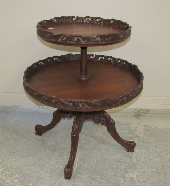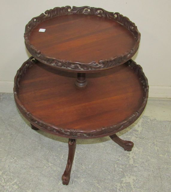 Ornate carved round gallery, two tier display table, mahogany, with four leg pedestal, some glue areas on trim, 30"h., 26"w. Ornate carved round gallery, two tier display table, mahogany, with four leg pedestal, some glue areas on trim, 30"h., 26"w.