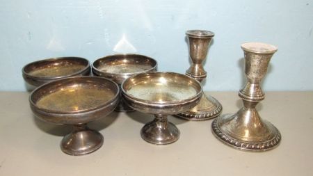Four cement filled compotes 3"h., 4"dia., Poole weighted candle holders, one missing top cap, 5"h. Four cement filled compotes 3"h., 4"dia., Poole weighted candle holders, one missing top cap, 5"h.