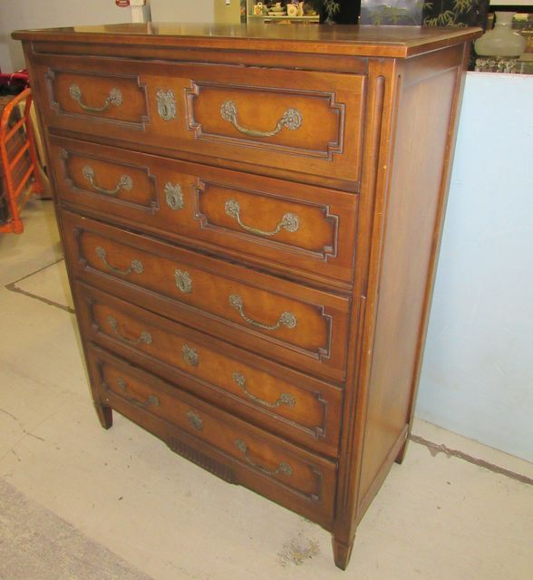 French provincial five drawer chest, ornate pulls, faux key hole, 51"h., 39"w., 19"d. French provincial five drawer chest, ornate pulls, faux key hole, 51"h., 39"w., 19"d.